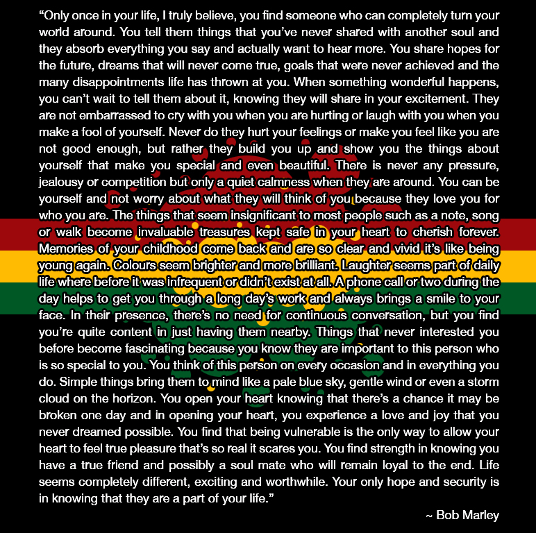 My post is simple today, though indeed thought-provoking. Below would be my number one pick of all Bob Marley’s quotes. The amount of love that erupts from this one wise paragraph has always overwhelmed me. Even so, I never could grasp the full intensity of it – just the intense yearning to someday find this beautiful kind of unconditional love. One without judgement, one that makes you want to learn new things, one that makes you feel beautiful, one where you openly invite vulnerability into your life. One Love.