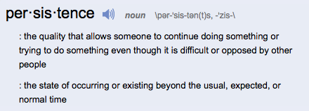 Continuing firmly or obstinately in a course of action in spite of difficulty or opposition. Donning your suit of armour, setting forth a plan of action for something you feel you can’t live without, never accepting defeat – making something so worthwhile to you actually happen.