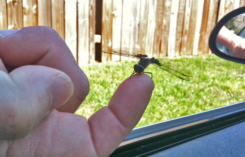 As it happened, this past weekend was to be insect weekend. From the front porch K motioned for me to come look through the storm door. He was holding a dragonfly, it’s little legs wrapped tight around his finger. He told me it was still a young one (obviously my understanding of the dragonfly aging-process needs work). K’s eagle-eyes found Junior on the ground and said he would be in danger if he got caught there during the looming storm.